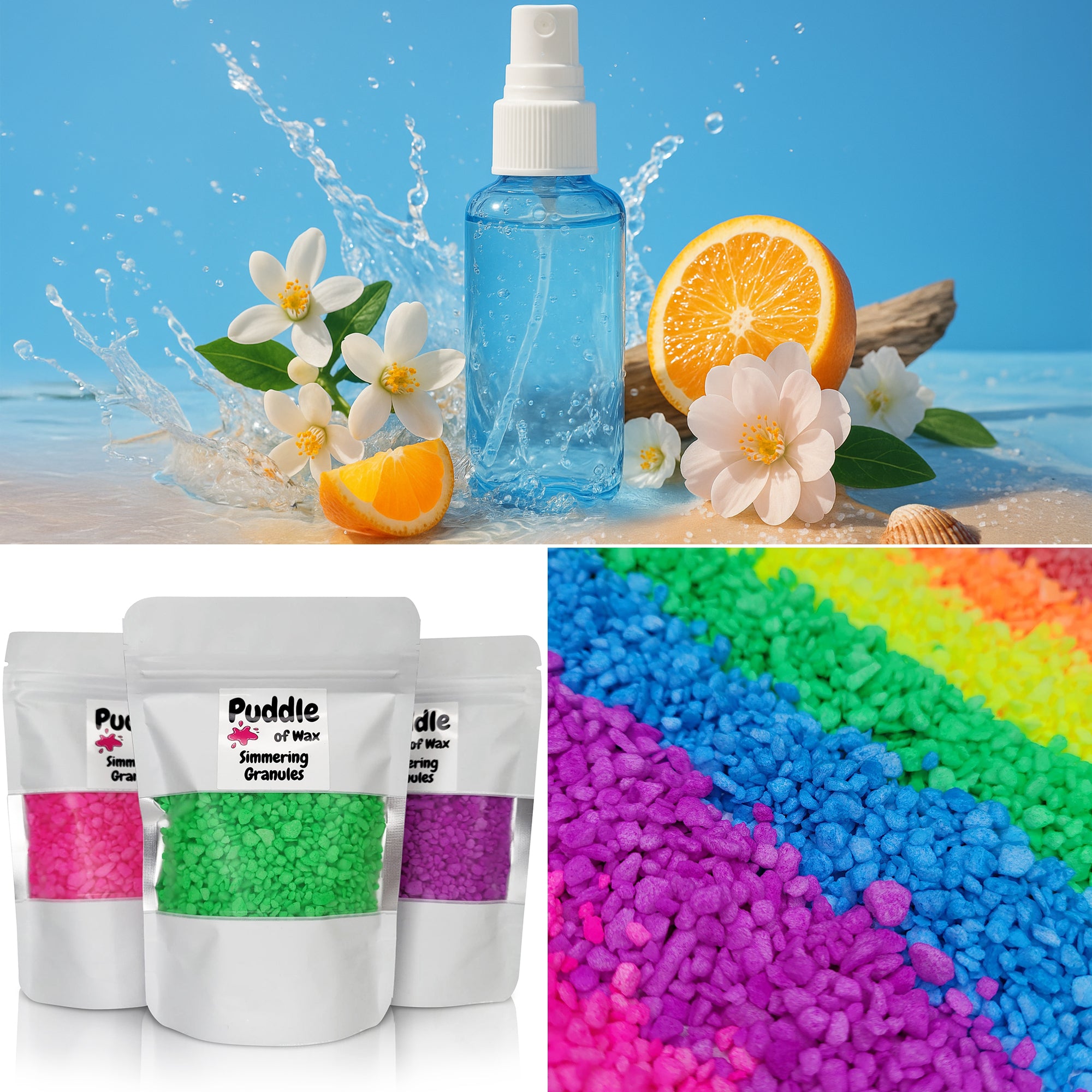 Simmering granules, also known as sizzlers or scented granules, are small beads infused with fragrance oil. They work similarly to wax melts and require no additional oil or water to use.