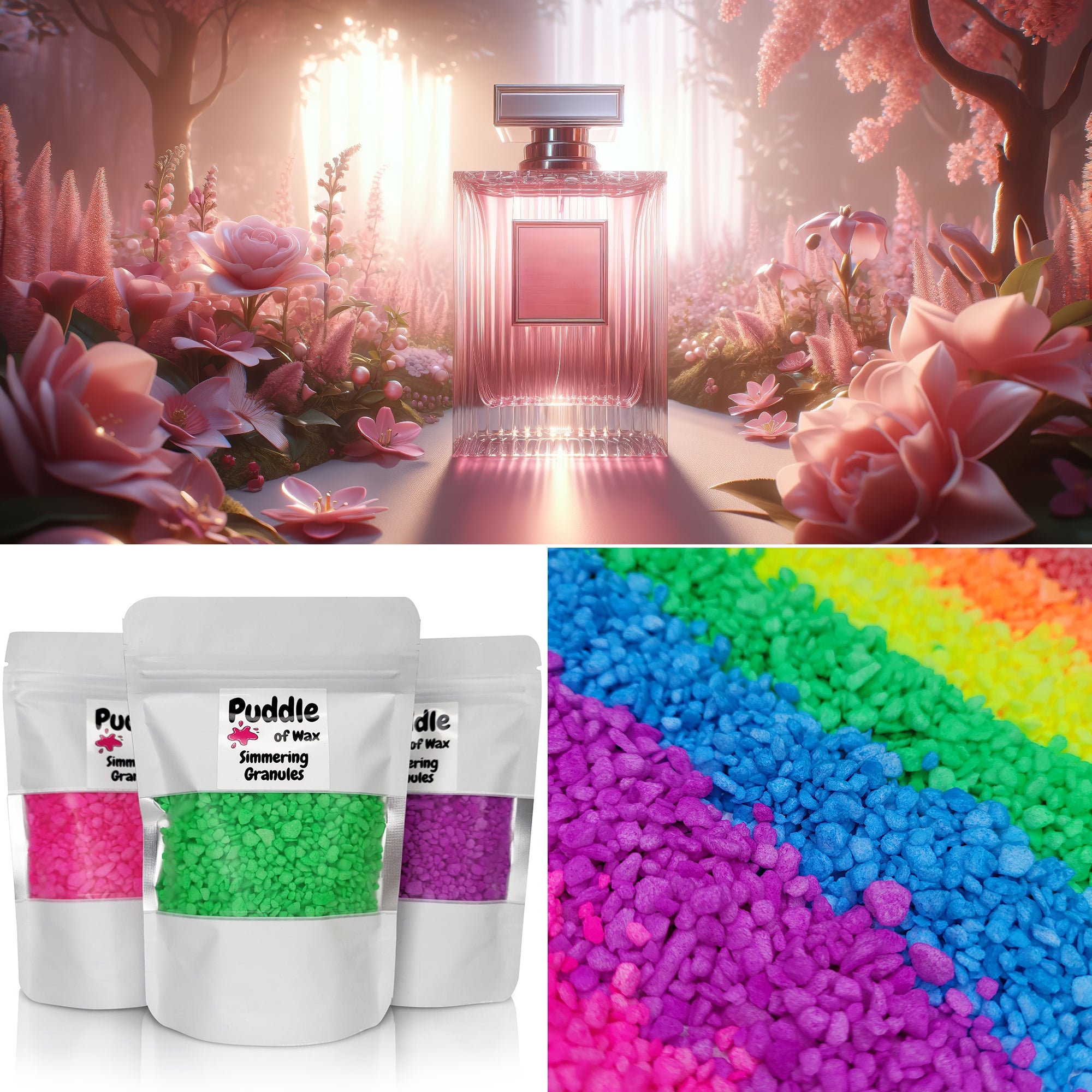 Simmering granules, also known as sizzlers or scented granules, are small beads infused with fragrance oil. They work similarly to wax melts and require no additional oil or water to use.
