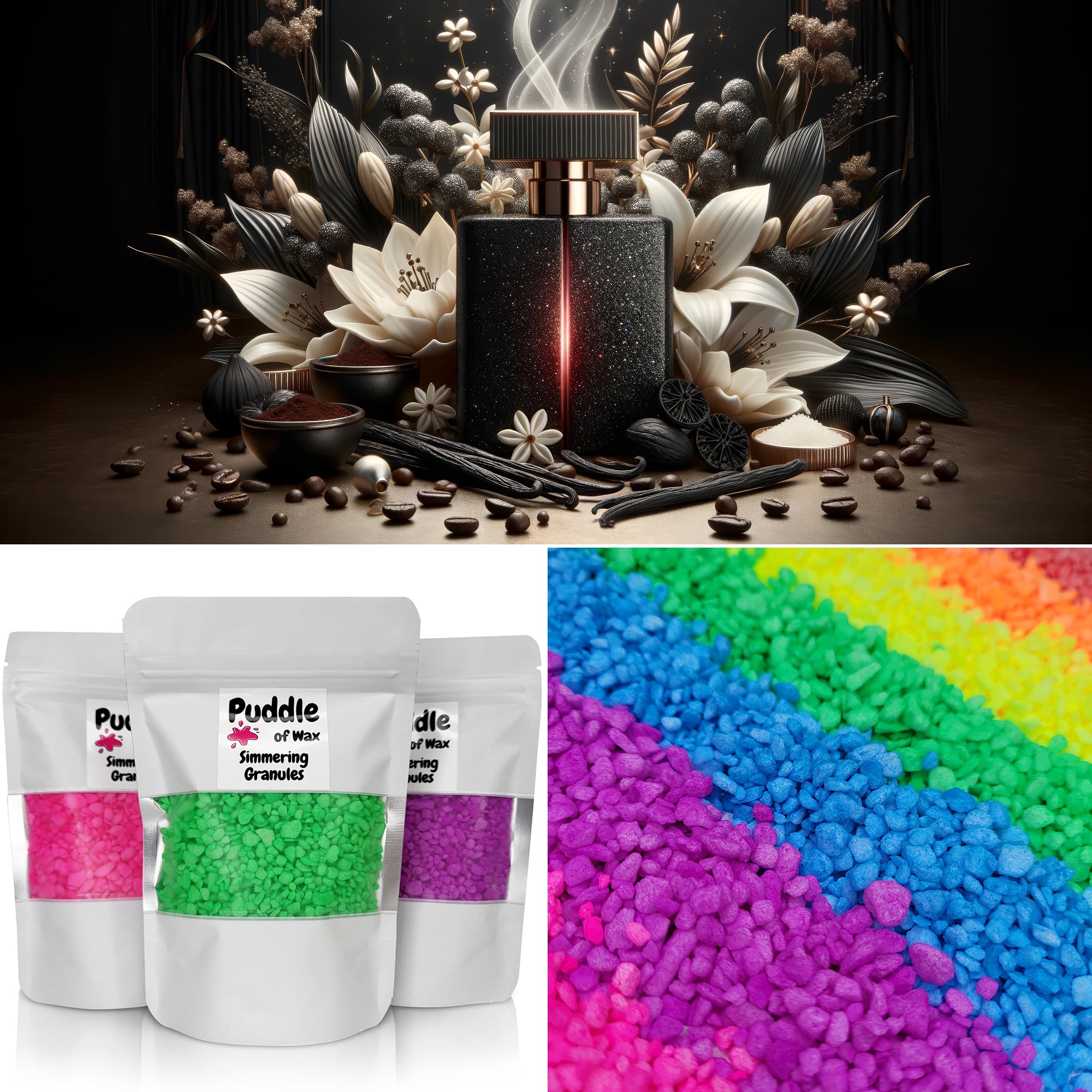 Simmering granules, also known as sizzlers or scented granules, are small beads infused with fragrance oil. They work similarly to wax melts and require no additional oil or water to use.