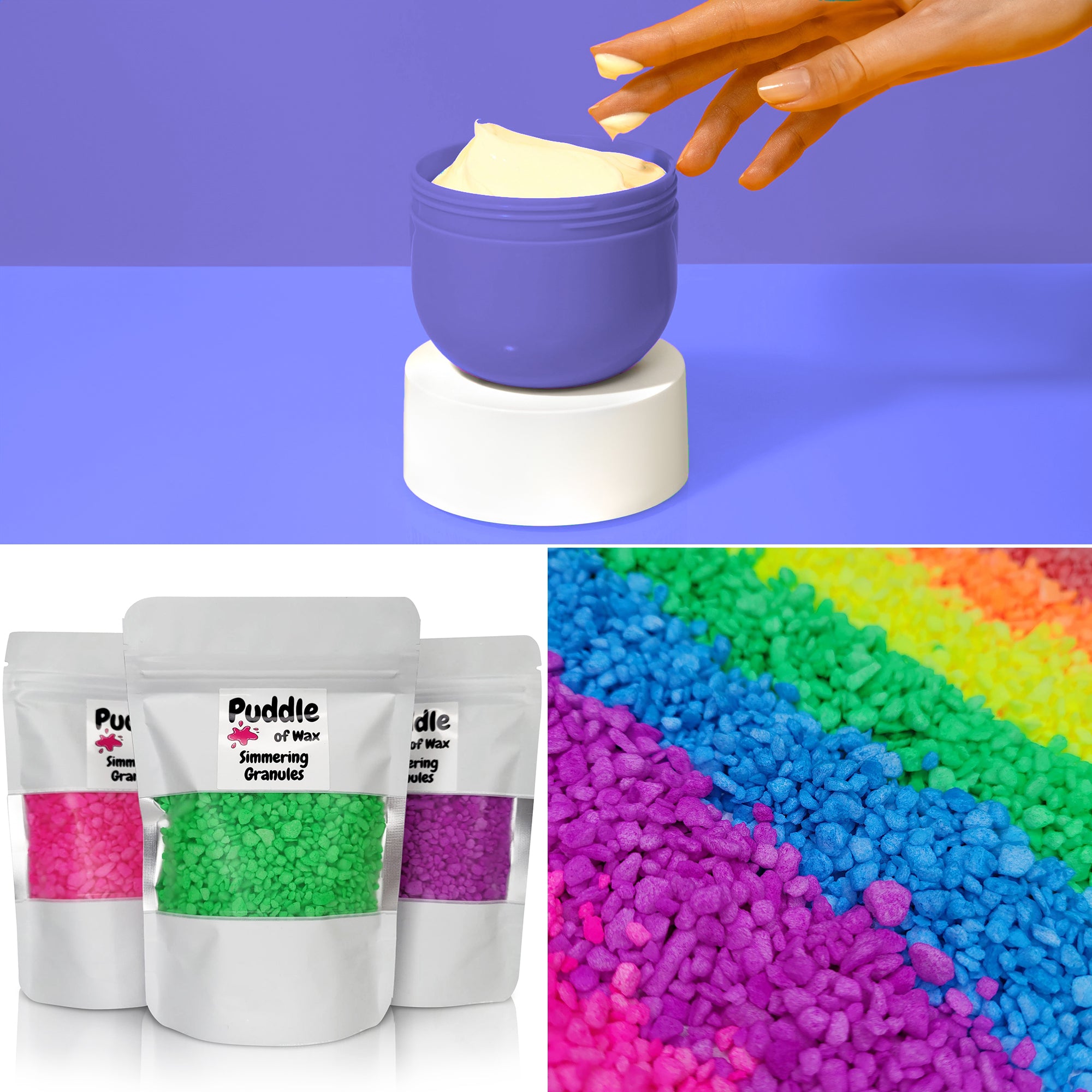 Simmering granules, also known as sizzlers or scented granules, are small beads infused with fragrance oil. They work similarly to wax melts and require no additional oil or water to use.