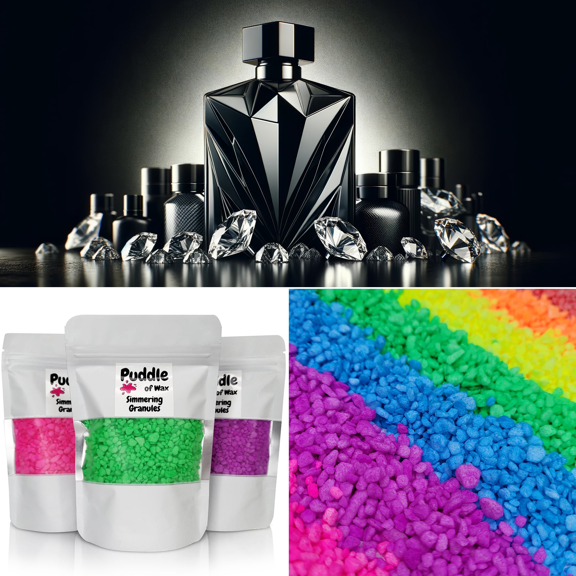 Simmering granules, also known as sizzlers or scented granules, are small beads infused with fragrance oil. They work similarly to wax melts and require no additional oil or water to use.