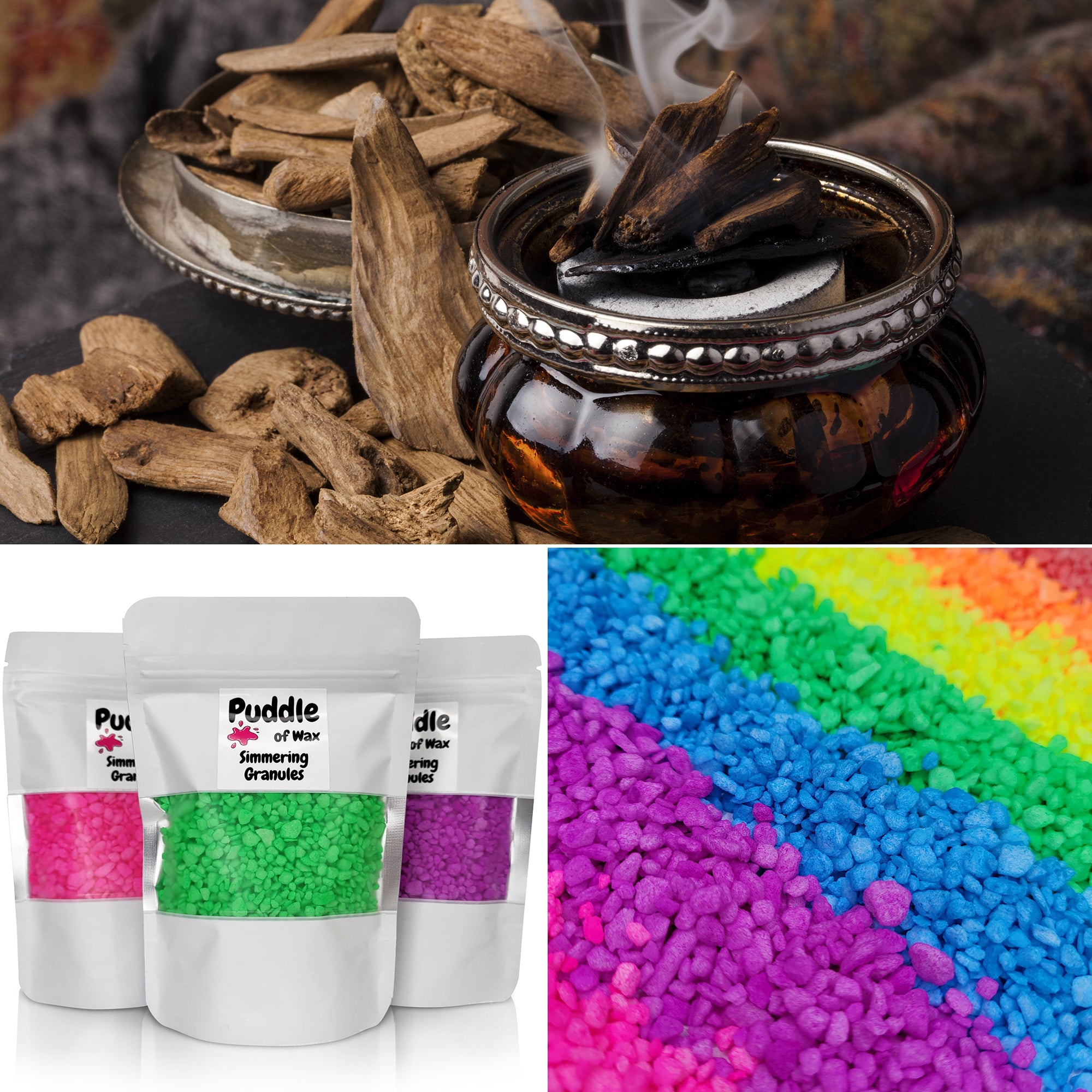 Simmering granules, also known as sizzlers or scented granules, are small beads infused with fragrance oil. They work similarly to wax melts and require no additional oil or water to use.