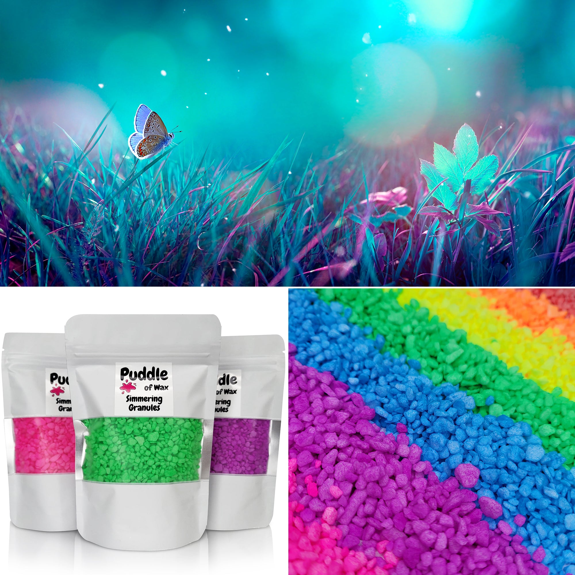 Simmering granules, also known as sizzlers or scented granules, are small beads infused with fragrance oil. They work similarly to wax melts and require no additional oil or water to use.