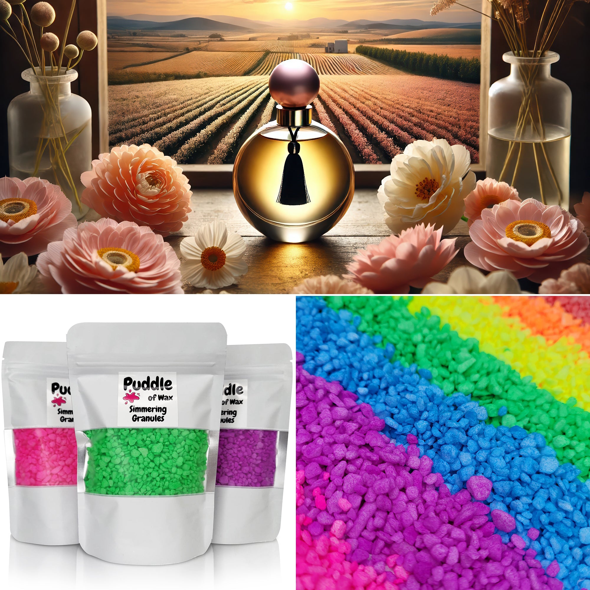 Simmering granules, also known as sizzlers or scented granules, are small beads infused with fragrance oil. They work similarly to wax melts and require no additional oil or water to use.