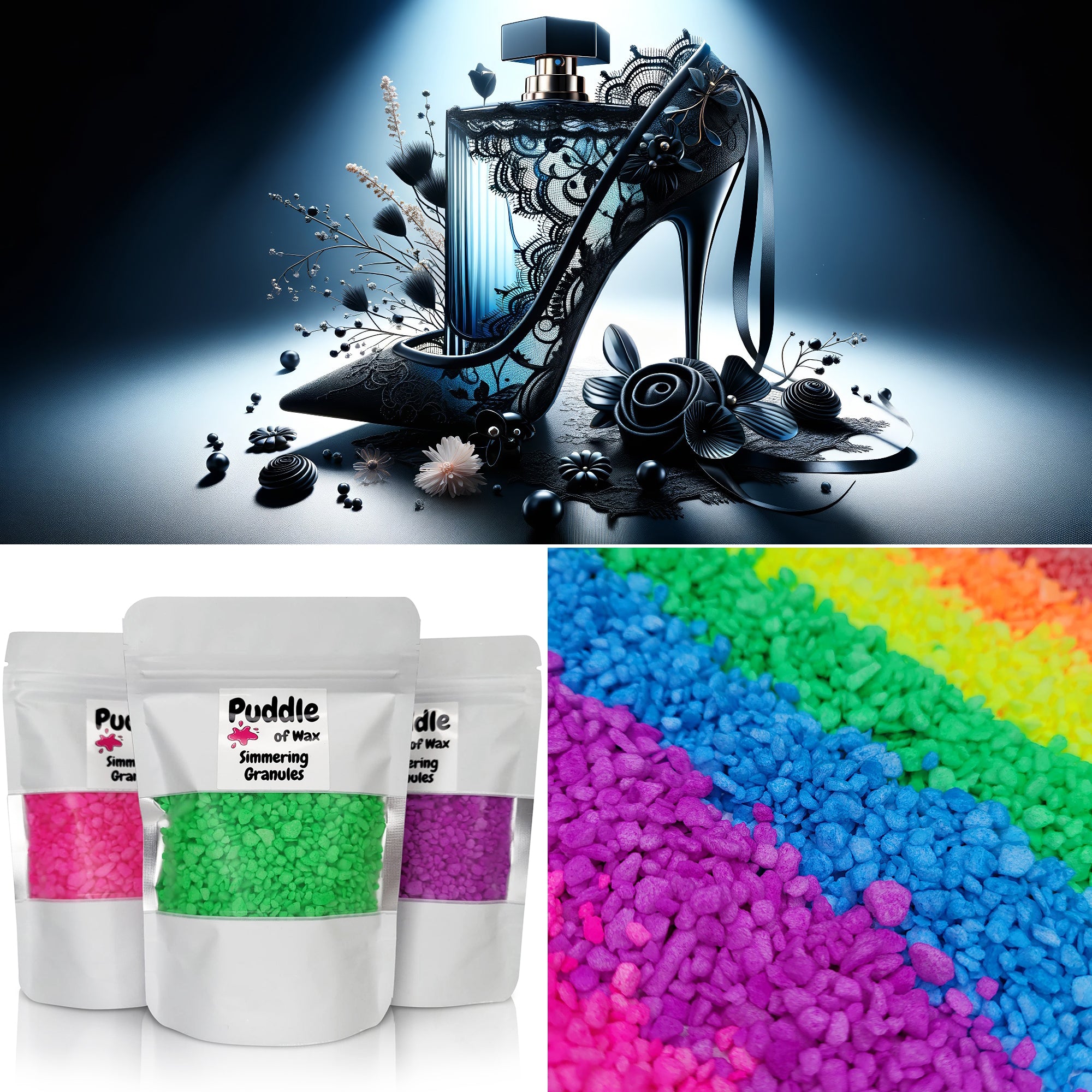 Simmering granules, also known as sizzlers or scented granules, are small beads infused with fragrance oil. They work similarly to wax melts and require no additional oil or water to use.