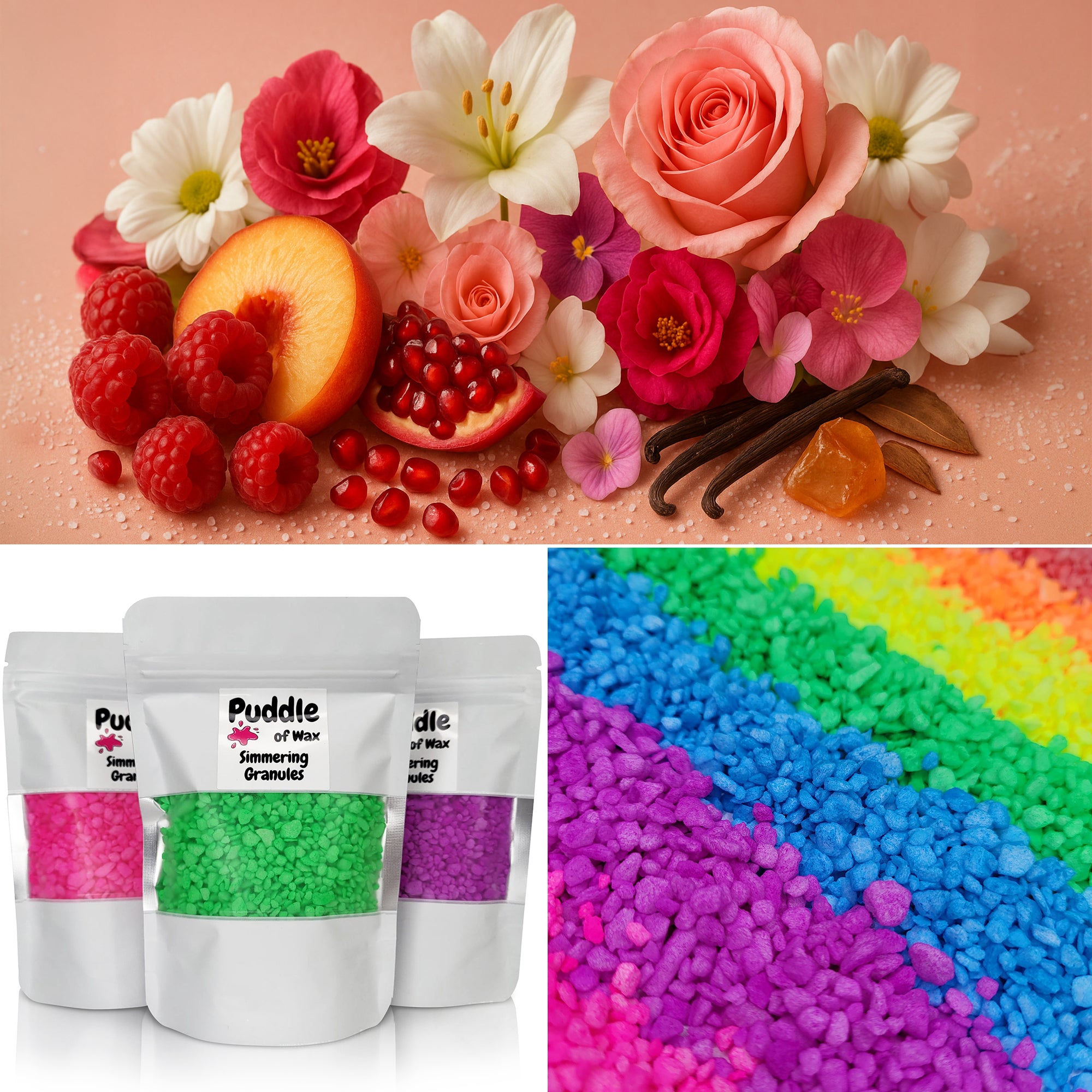 Simmering granules, also known as sizzlers or scented granules, are small beads infused with fragrance oil. They work similarly to wax melts and require no additional oil or water to use.