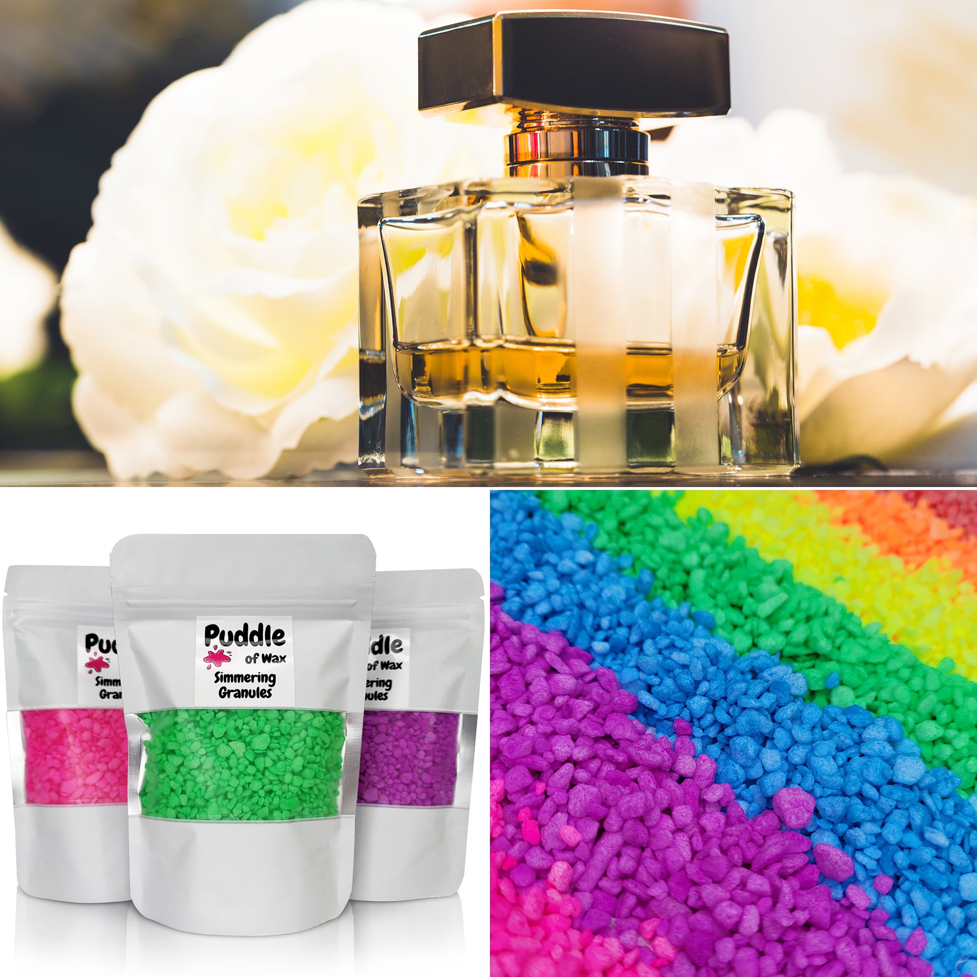 Simmering granules, also known as sizzlers or scented granules, are small beads infused with fragrance oil. They work similarly to wax melts and require no additional oil or water to use.