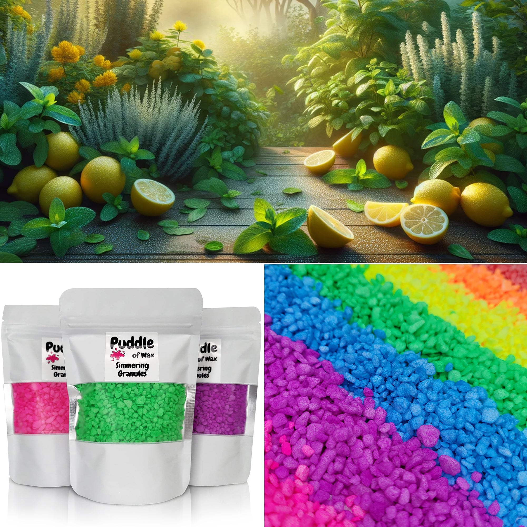 Simmering granules, also known as sizzlers or scented granules, are small beads infused with fragrance oil. They work similarly to wax melts and require no additional oil or water to use.