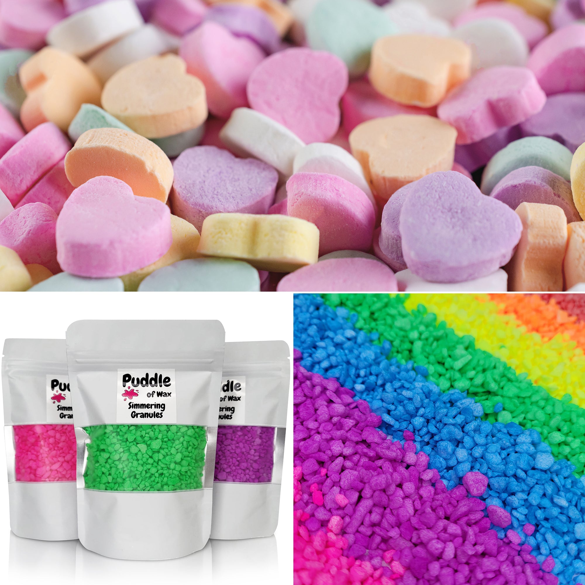 Simmering granules, also known as sizzlers or scented granules, are small beads infused with fragrance oil. They work similarly to wax melts and require no additional oil or water to use.