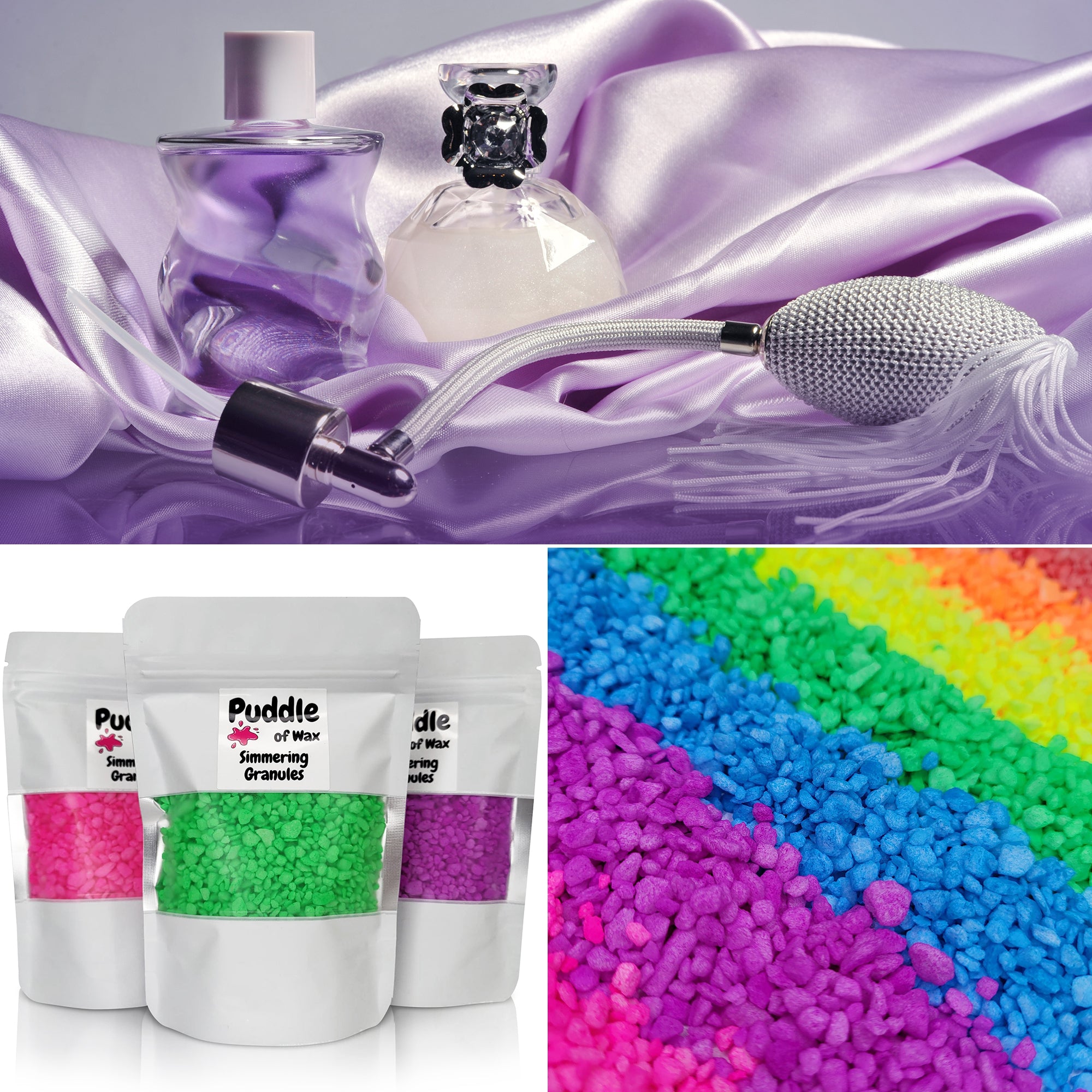 Simmering granules, also known as sizzlers or scented granules, are small beads infused with fragrance oil. They work similarly to wax melts and require no additional oil or water to use.