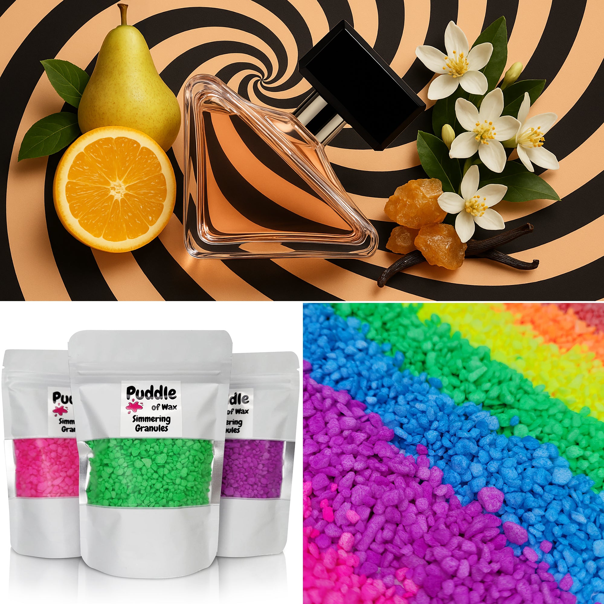 Simmering granules, also known as sizzlers or scented granules, are small beads infused with fragrance oil. They work similarly to wax melts and require no additional oil or water to use.