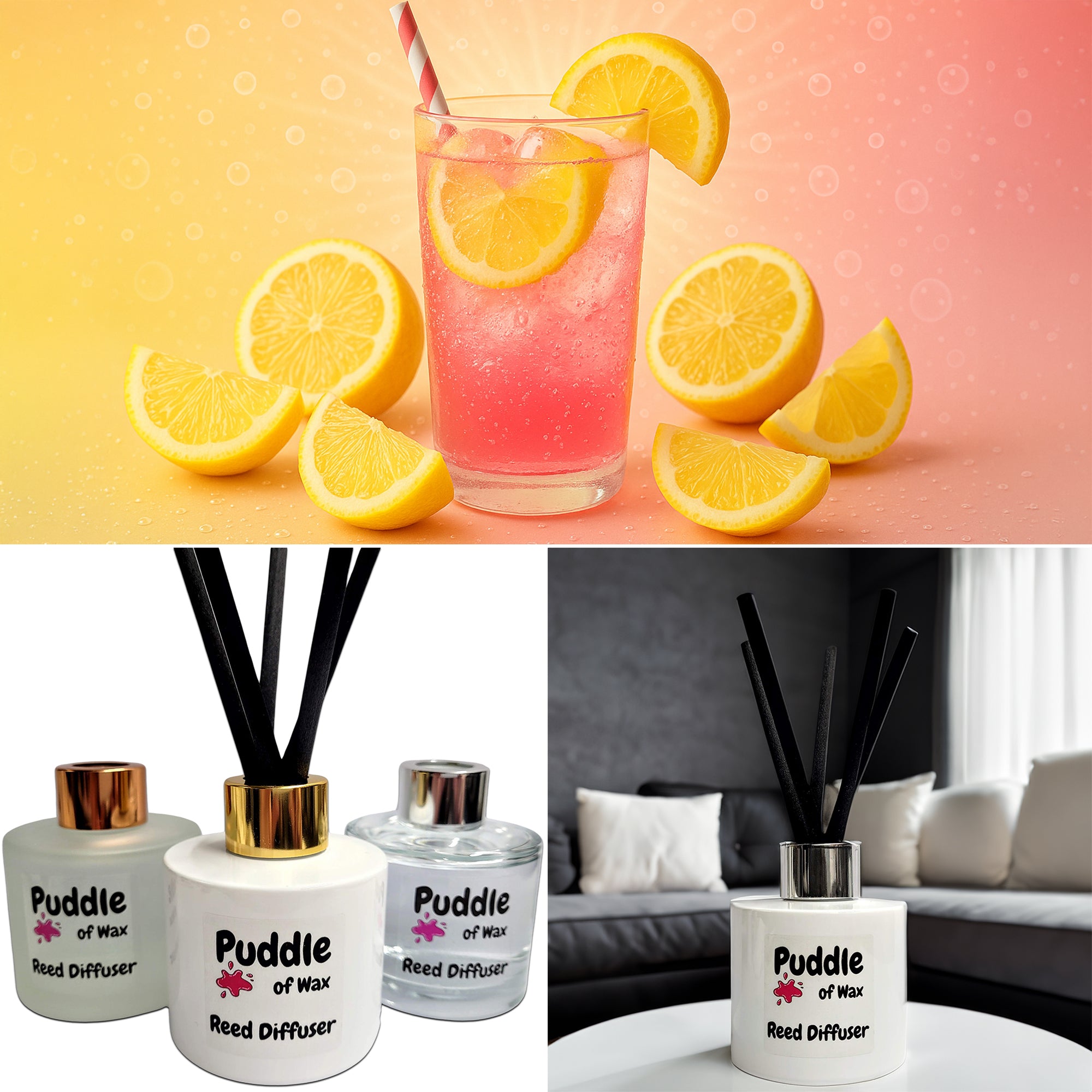 Pink Lemonade Scent: A sparking fragrance with notes of citrus fruits leading to a heart of citrus and a hint of sweet raspberries resting on a base of sweet vanilla sugar.