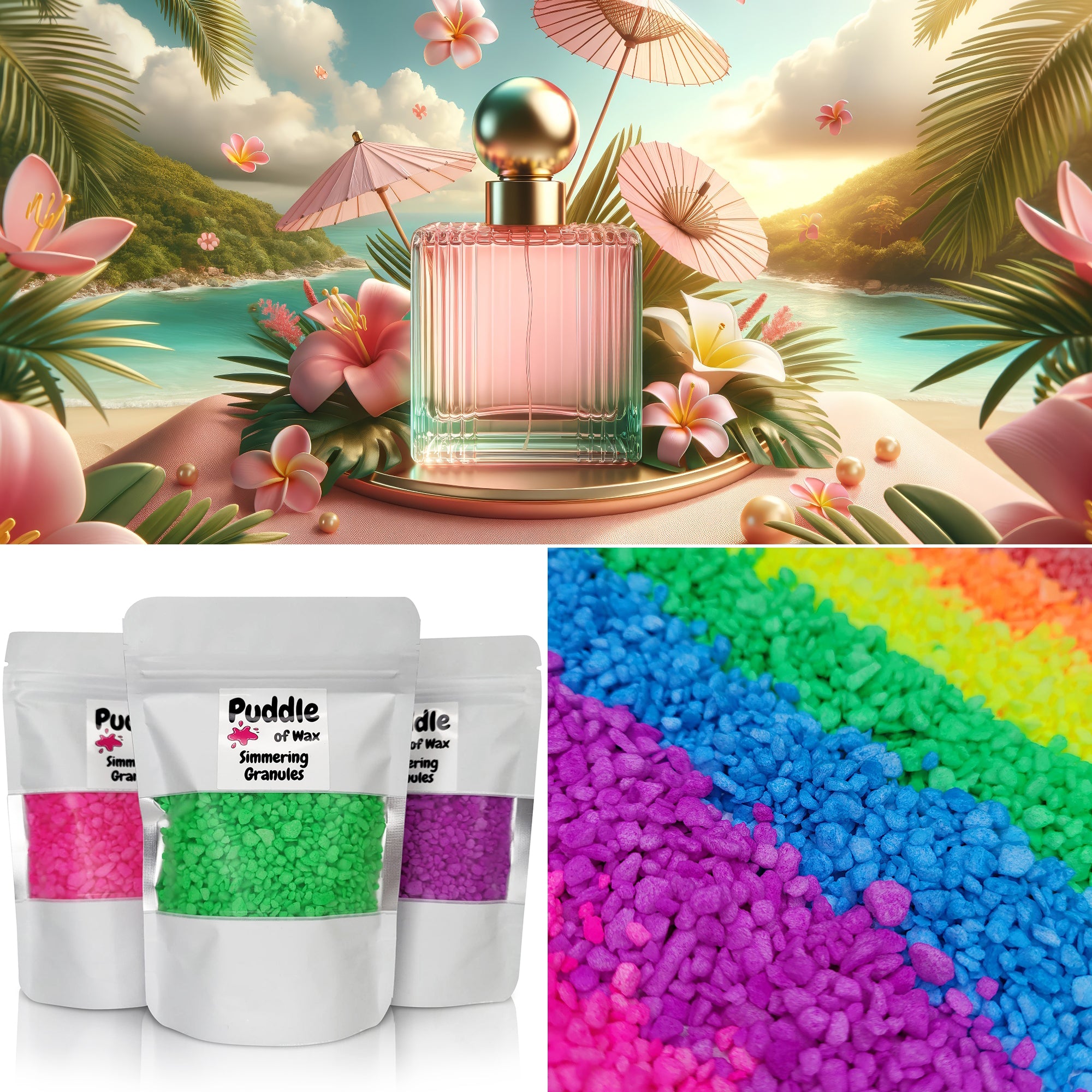 Simmering granules, also known as sizzlers or scented granules, are small beads infused with fragrance oil. They work similarly to wax melts and require no additional oil or water to use.