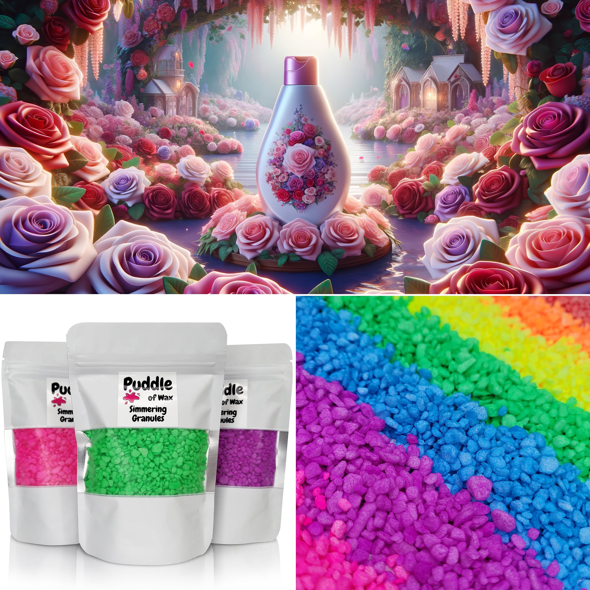 Simmering granules, also known as sizzlers or scented granules, are small beads infused with fragrance oil. They work similarly to wax melts and require no additional oil or water to use.
