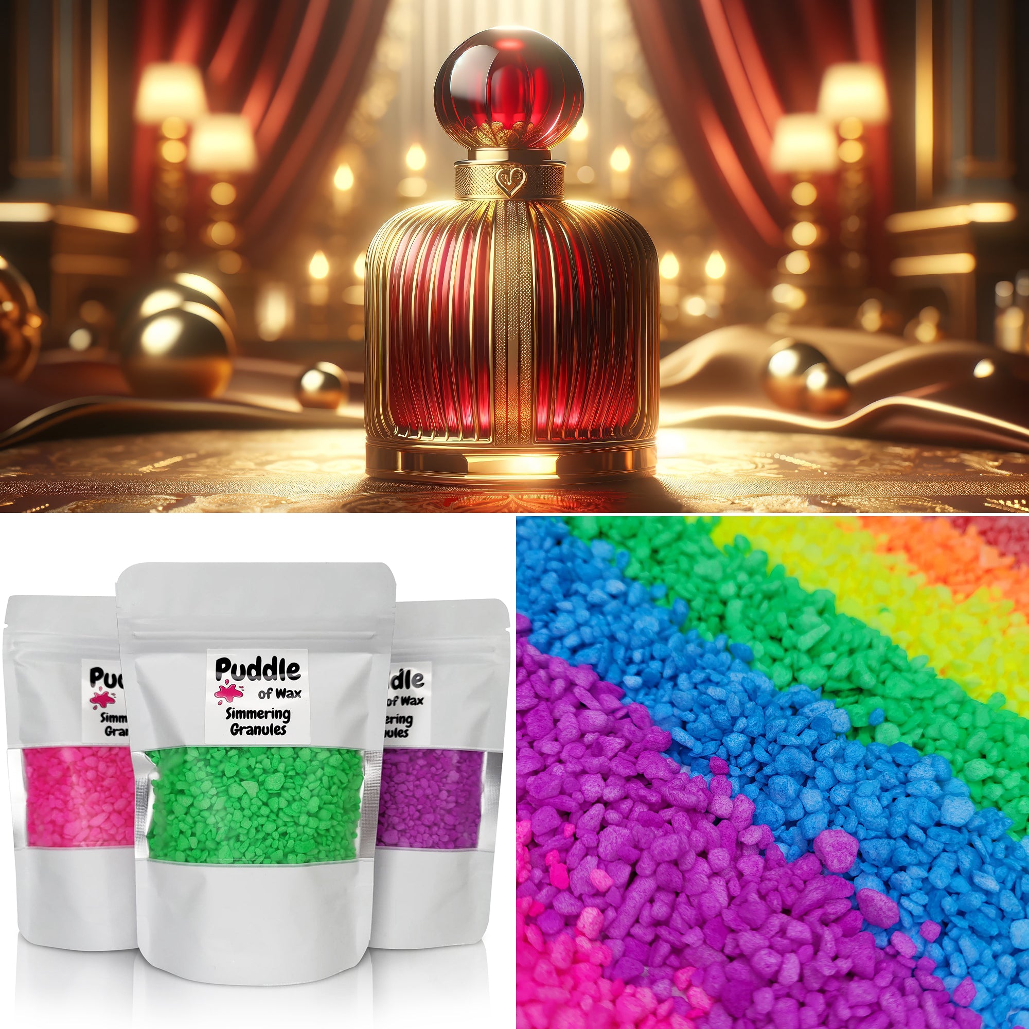 Simmering granules, also known as sizzlers or scented granules, are small beads infused with fragrance oil. They work similarly to wax melts and require no additional oil or water to use.