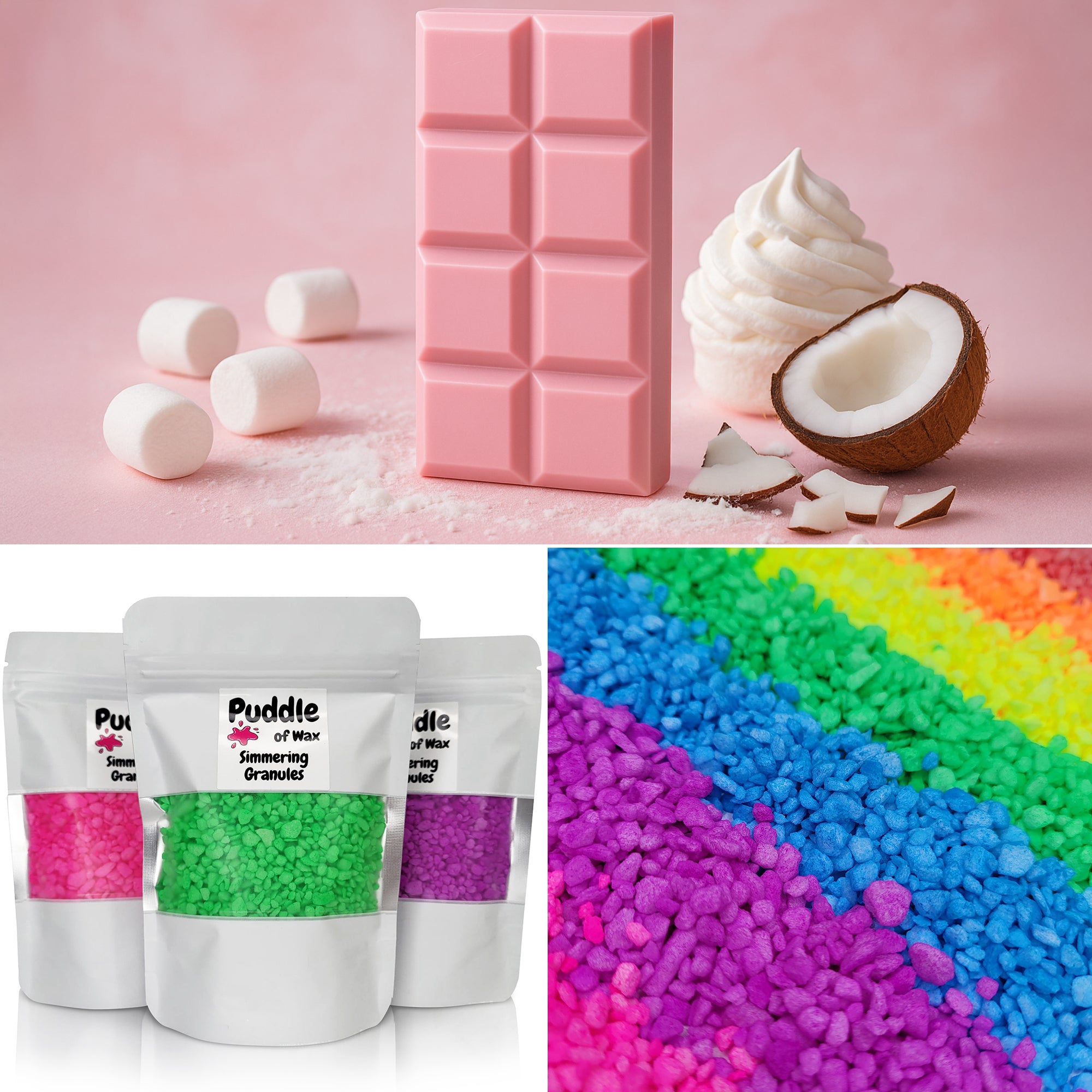 Simmering granules, also known as sizzlers or scented granules, are small beads infused with fragrance oil. They work similarly to wax melts and require no additional oil or water to use.
