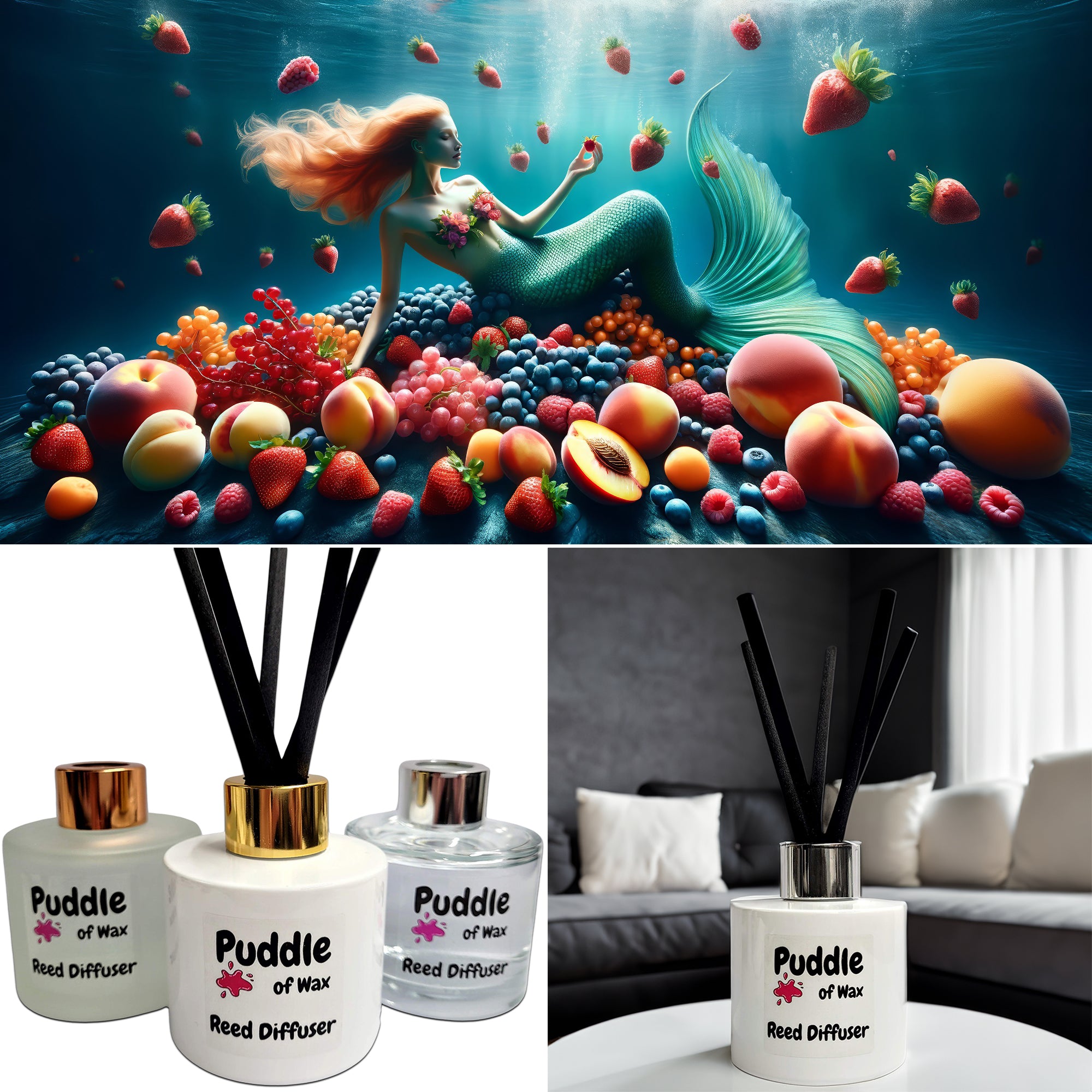 Twisted Mermaid Scent: A sweet fruity accord with notes of strawberry, peach, raspberry and rhubarb, with a hint of green leaf, followed by a touch of florality, all resting on a base of vanilla.