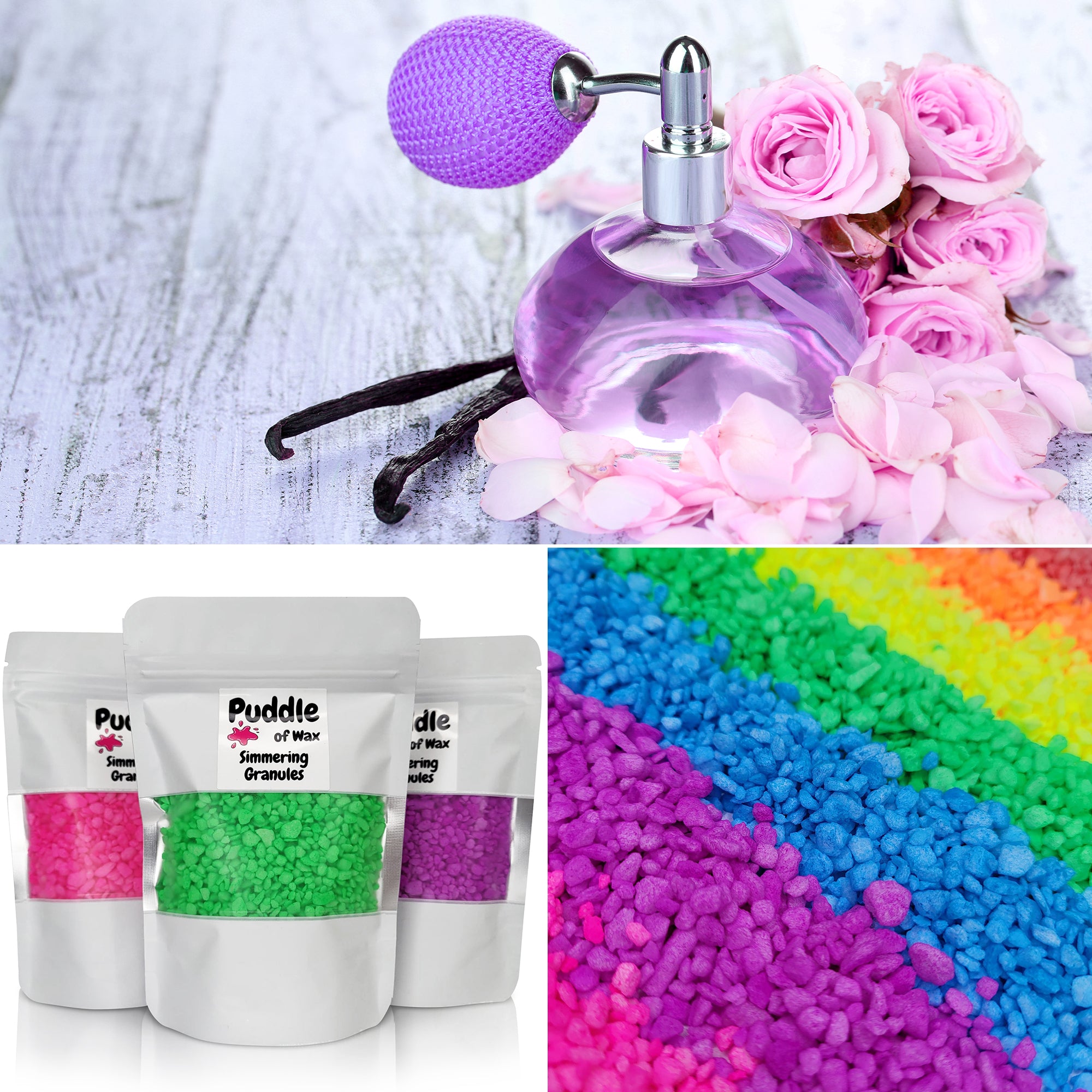Simmering granules, also known as sizzlers or scented granules, are small beads infused with fragrance oil. They work similarly to wax melts and require no additional oil or water to use.