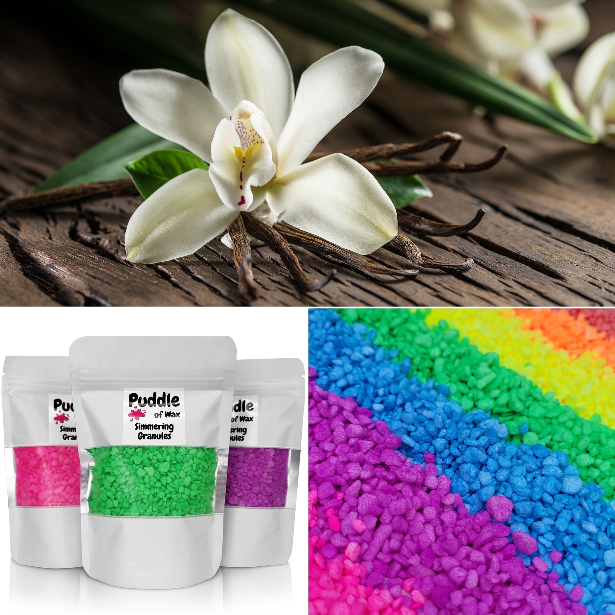 Simmering granules, also known as sizzlers or scented granules, are small beads infused with fragrance oil. They work similarly to wax melts and require no additional oil or water to use.