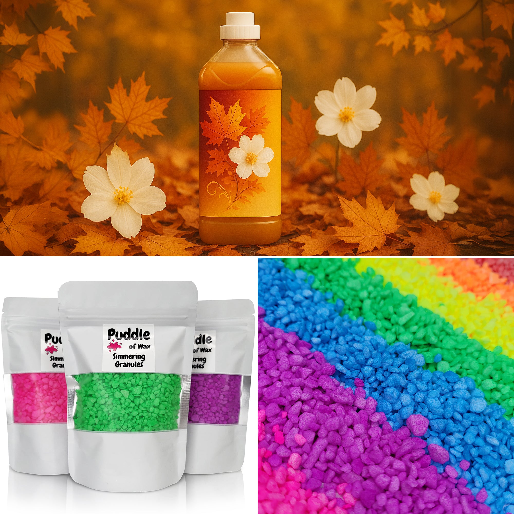 Simmering granules, also known as sizzlers or scented granules, are small beads infused with fragrance oil. They work similarly to wax melts and require no additional oil or water to use.