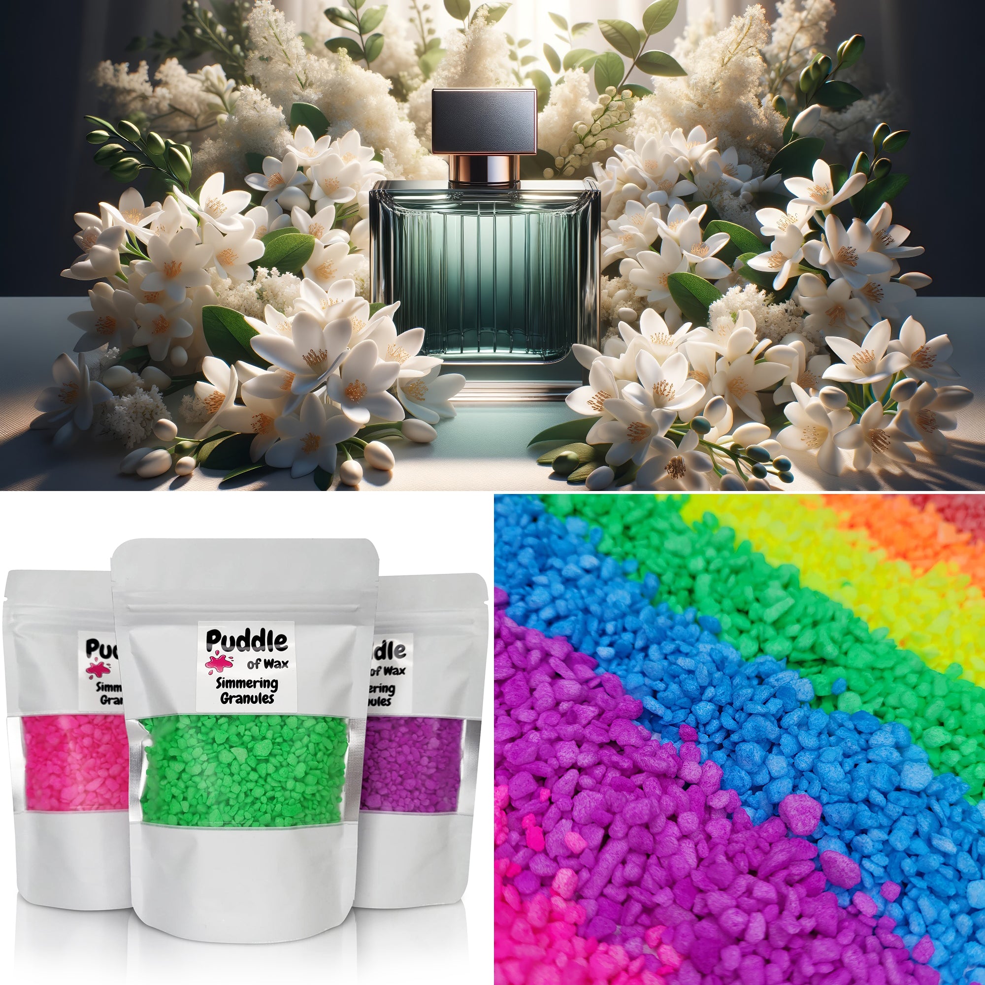 Simmering granules, also known as sizzlers or scented granules, are small beads infused with fragrance oil. They work similarly to wax melts and require no additional oil or water to use.
