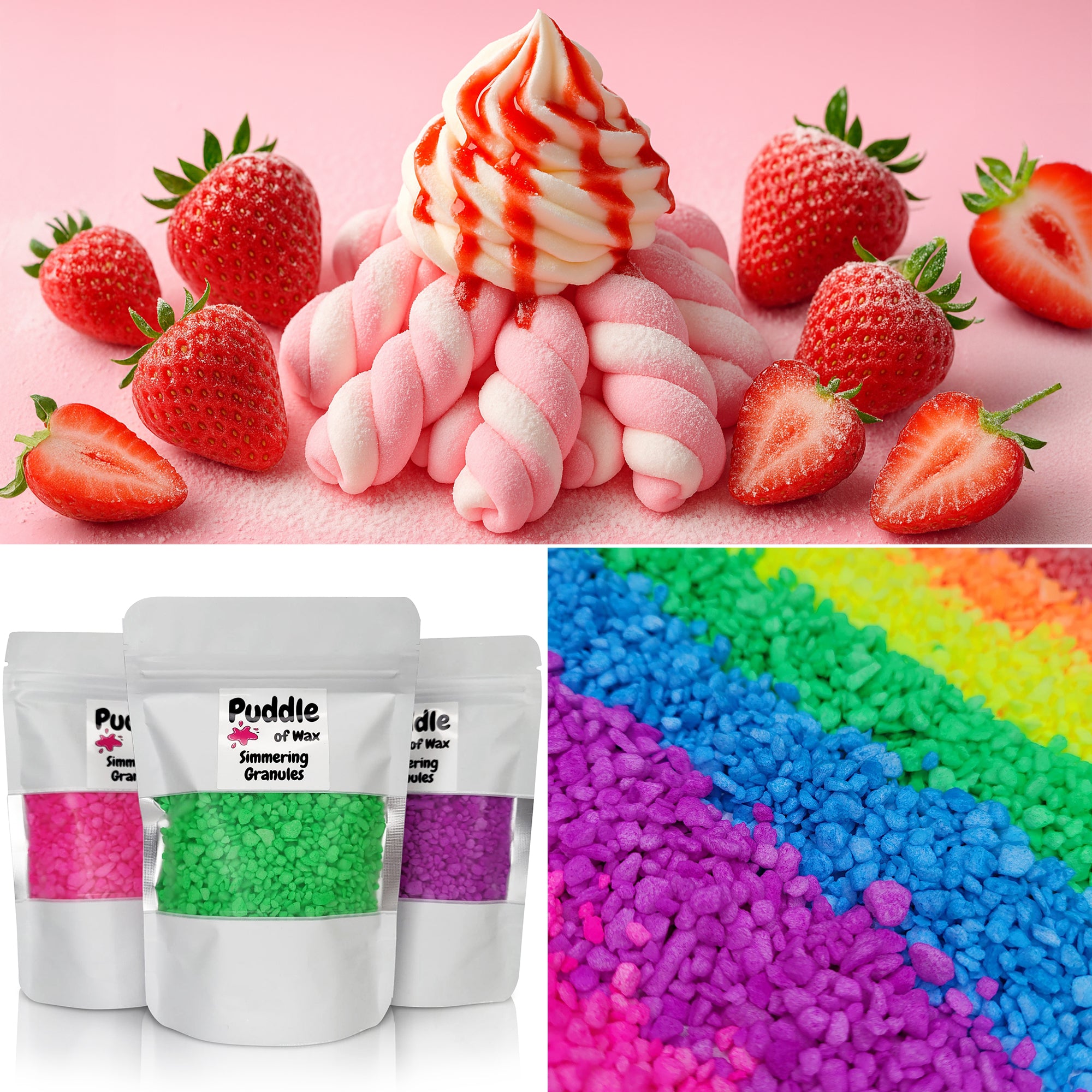 Simmering granules, also known as sizzlers or scented granules, are small beads infused with fragrance oil. They work similarly to wax melts and require no additional oil or water to use.