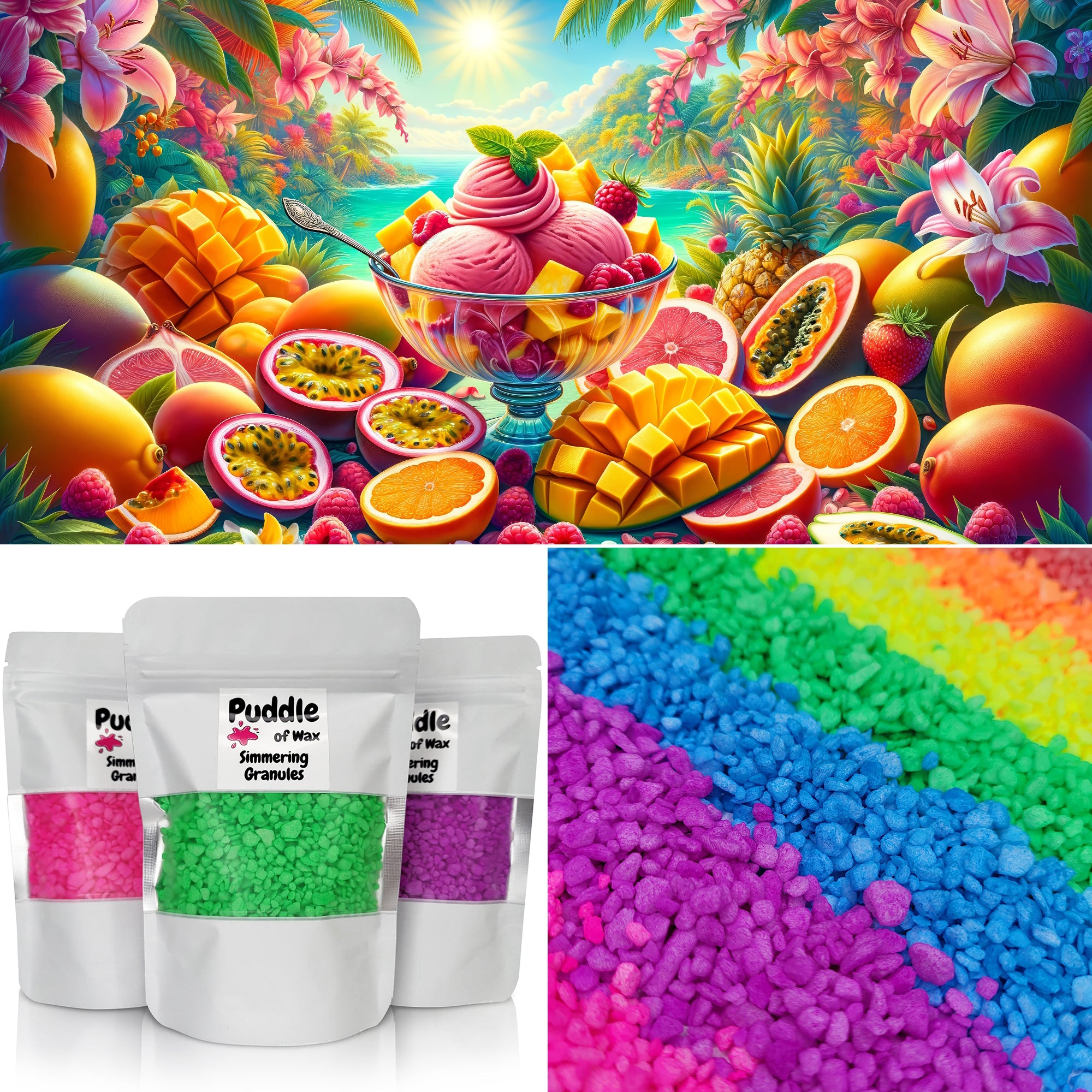Simmering granules, also known as sizzlers or scented granules, are small beads infused with fragrance oil. They work similarly to wax melts and require no additional oil or water to use.